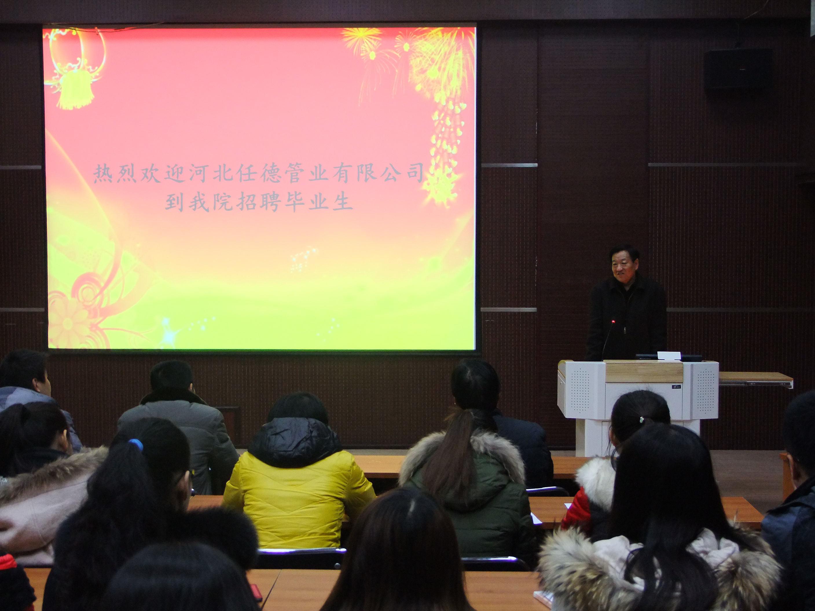 12月24日上午,威廉希尔官网与河北任德管业有限公司在威廉希尔官网MBA教室共同举办老员工招聘会,公司党委副书记马振远亲临现场指导就业工作。工商管理公司党总支书记李廷湘、经理王春和、就业处副处长张震出席了此次招聘会。招聘会由工商管理公司党总支副书记贾喜环主持,公司100余名毕业生参加了招聘会。