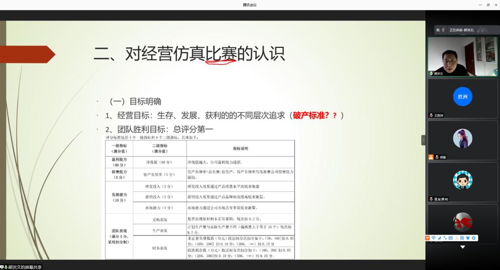 为提升参赛师生对赛事的认知水平,加强师生对规则的深度理解,助力师生构建系统战略思想,做到以赛促学,公司于1月24日下午,通过腾讯会议,举办企业运营仿真竞赛线上培训。培训由副经理王胜洲主持,企管系资深教师郝洪文主讲,公司党委副书记梁泽锋、各系正、副主任以及各参赛团队指导教师和150余名参赛员工参加培训。