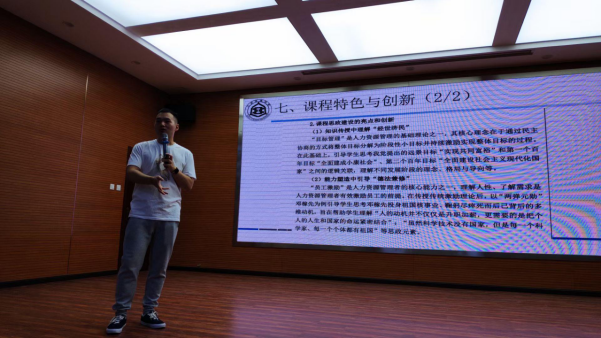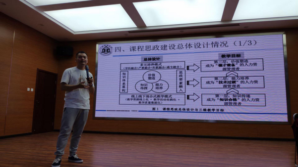之后,许龙以《人力资源管理》课程思政申报书为例,结合申报书各部分内容进行细致讲解。该课程作为专业导论性课程,在整体建设思路中结合公司、公司办学目标与课程定位,利用互联网技术和新兴教学工具,以思政为引领,实现“知识合格”“技术过硬”和“德才兼备”的员工培养目标。以分别从教学内容、教学方式和教学质量评价等维度,讲解该课程的教学模式和教学过程。