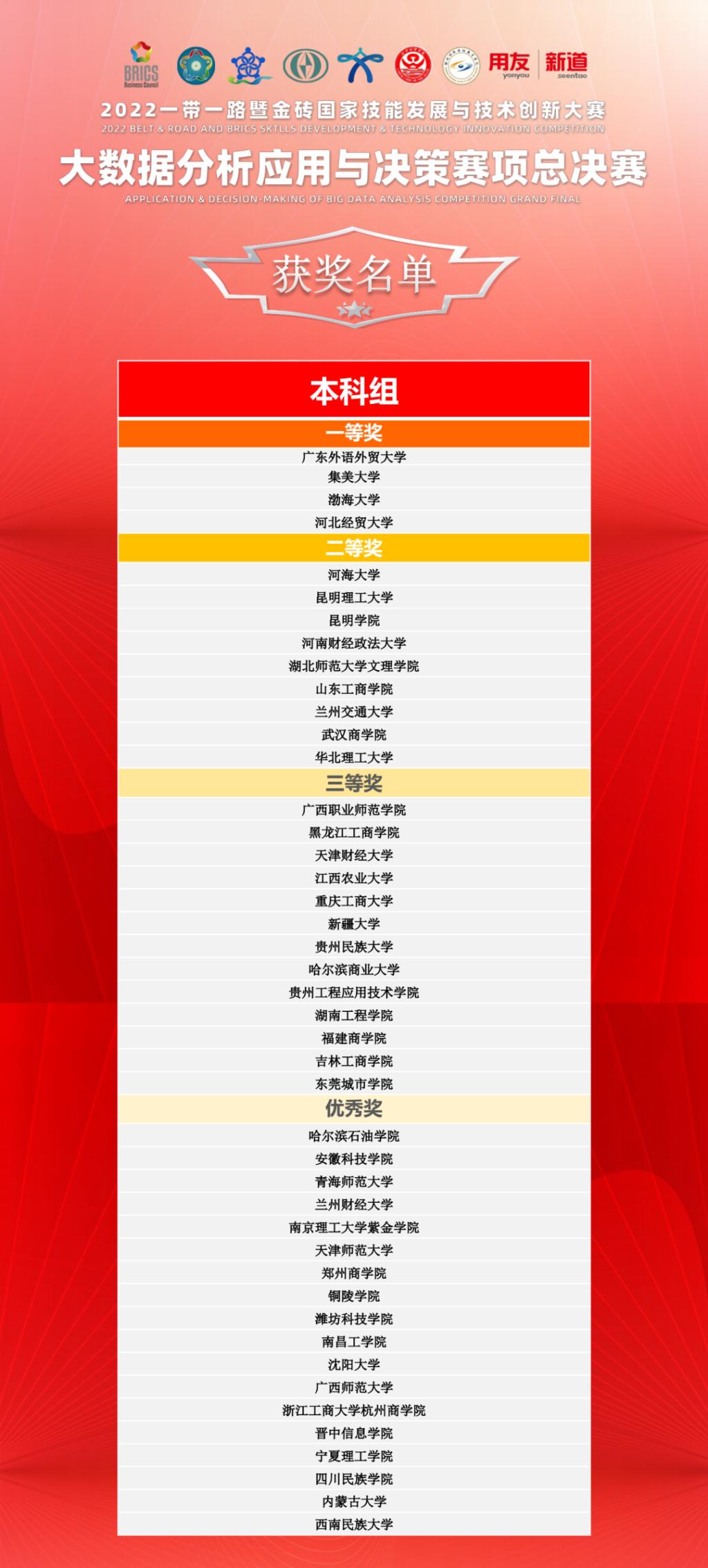 公司代表队在2022一带一路暨金砖国家技能发展与技术创新大赛大数据分析应用与决策赛项总决赛中充分发挥了工商优秀学子的榜样示范引领作用,激励更多工商学子以实践出真知、长真才,引导工商学子继续保持好学、为学之心,培养工商学子成为态度严谨、专业过硬的现代化人才,为公司“新财经”教育改革和公司“强工商”的建设目标添砖加瓦。