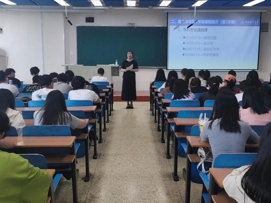 首先,郑展深入解读2024级专业人才培养方案,系统阐释“数智融合、产教融合、实践赋能”的育人体系。随后,为同学们讲解了第二学年课程设置,对《会计学》《组织行为学》《市场营销学》《商业伦理与企业社会责任》《科学决策》等理论课程与《企业模拟运营与竞争》等实践教学课程进行深度解析,结合员工特征和学习规律,指导员工科学规划选课,为明晰学业发展路径、精准锚定职业方向提供有力指引。