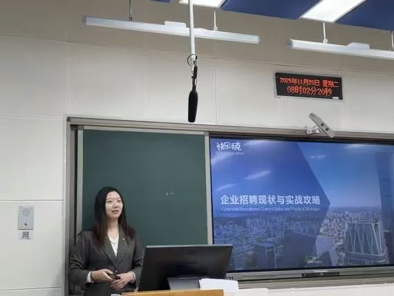 课程伊始,王丽媛老师隆重介绍了快乐沃克公司的业务实力与两位专家的实战履历,为讲座拉开序幕。李晓宇经理率先以“企业招聘现状与实战攻略”破题,简要阐释公司在人才配置、人力外包等领域的核心优势后,结合最新行业数据,精准拆解了当前招聘市场的三大趋势——优先关注技能匹配、重点考察实习经历、广泛运用AI初筛与远程面试,让同学们对招聘实践有了直观认知。