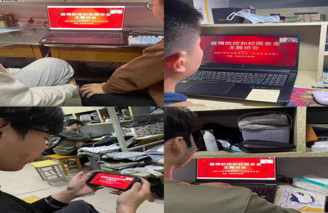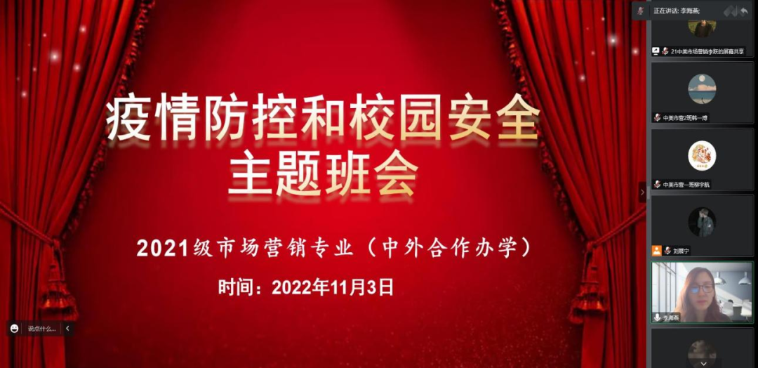 为使同学们充分认识疫情防控的严峻形势,引导员工树立校园安全防范意识,加强自我防护,11月3日上午,威廉希尔官网2021级市场营销专业(中外合作办学)召开“疫情防控和校园安全”主题班会,此次活动由辅导员李海燕主持,2021级市场营销专业(中外合作办学)全体同学通过腾讯会议参加。