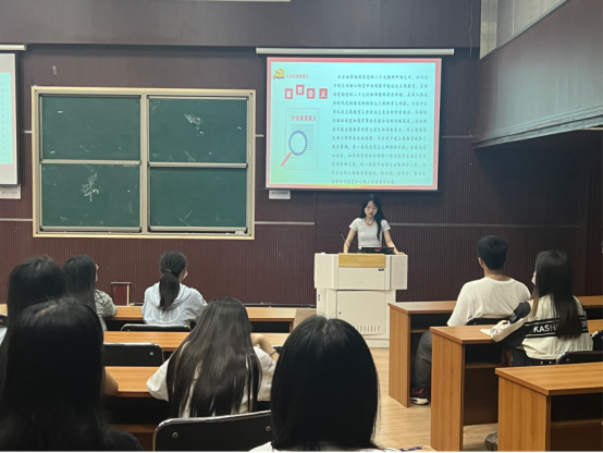 会议伊始,团支书吕雅诗带领同学们学习了党的二十大的重大意义和精神实质,引导同学们牢记使命担当,增强共青团员的责任感和使命感,展现共青团员的良好精神风貌。接着,大家共同回顾了党和国家事业实现的一系列突破性进展,进一步加强同学们的思想引领,激发团结向上奋进的力量。团支书吕雅诗以脱贫攻坚、科技创新、中华文化等方面的“成就案例”引领同学们更深入感悟党的二十大精神内涵,从中寻找红色基因,传承红色血脉。同学们纷纷表示,要在学习中把弘扬爱国主义精神、传承红色基因与学习贯彻党的二十大精神三者有机统一,用实际行动谱写新时代中国特色社会主义的绚丽华章。最后,吕雅诗呼吁同学继续深入学习贯彻党的二十大精神,以习近平新时代中国特色社会主义思想为指引,高举中国特色社会主义伟大旗帜,为实现中华民族伟大复兴贡献青春智慧和力量。