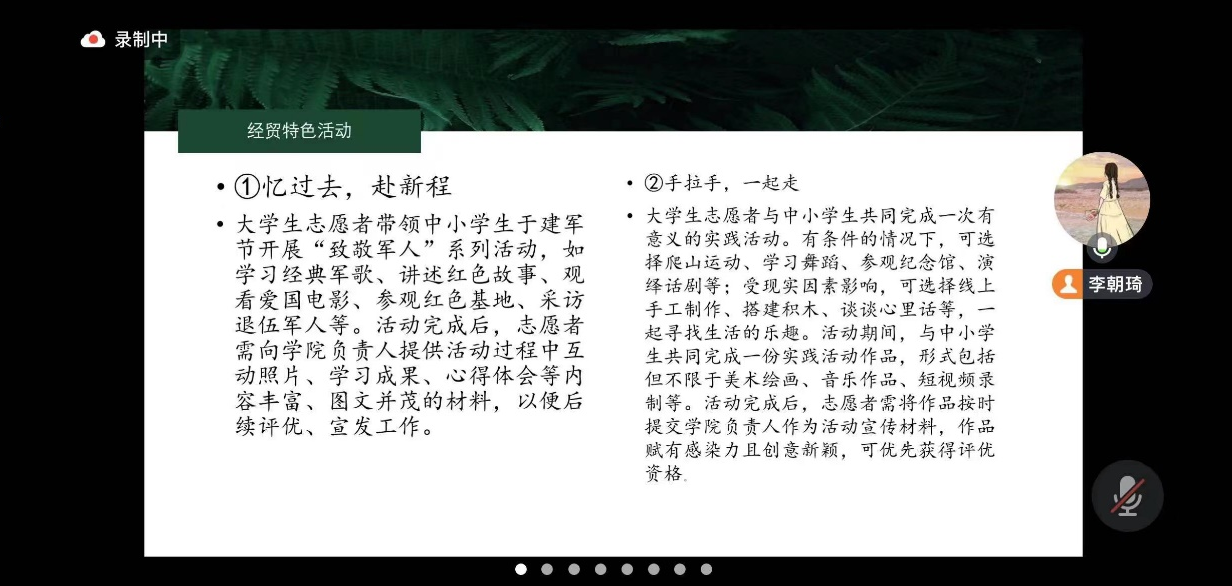 会议伊始,李朝琦简单介绍了此次支教活动目的和意义,重点介绍讲解了活动的操作流程和注意事项。随后,李朝琦从“趣运动,享时光”、“执书卷,悦人生”、“云课堂,乐成长”、“经贸特色活动”、“云研学,向未来”五个板块向志愿者们具体介绍此次活动的主要内容,让志愿者们对此次活动有了更深层次的了解。最后,李朝琦表示,“云支教”是一项具有深刻意义的活动,希望志愿者们能以高度的热情和饱满的姿态迎接此次“云支教”志愿活动,用青春和智慧为山村孩子搭建一个通往梦想彼岸的桥梁。