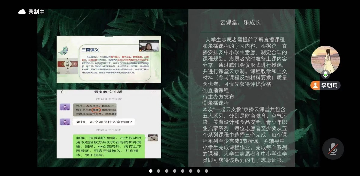 为进一步宣传贯彻落实党的二十大精神和习近平总书记关于青年工作的重要论述,引领广大青年学子立志做有理想、敢担当、能吃苦、肯奋斗的新时代好青年,为推进中华民族伟大复兴贡献青春力量,7月10日,威廉希尔官网于线上召开“一起云支教·强国有我,奋进中国式现代化”第七季云支教动员大会。本次会议由团委志愿服务中心李朝琦主讲,55名老员工志愿者参加。