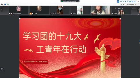 为深入学习团十九大精神、党中央致词、团十九大报告,积极响应党中央号召,为本班团支部“找差距、补短板”“再出发、在奋进”,7月22日,威廉希尔官网2021级市场营销1班于线上开展了以“学习团的十九大,工商青年在行动”为主题的团日活动。本次班会由团支书王子穆策划,宣传委员程思尹主持,2021级市场营销一班全体同学参加。