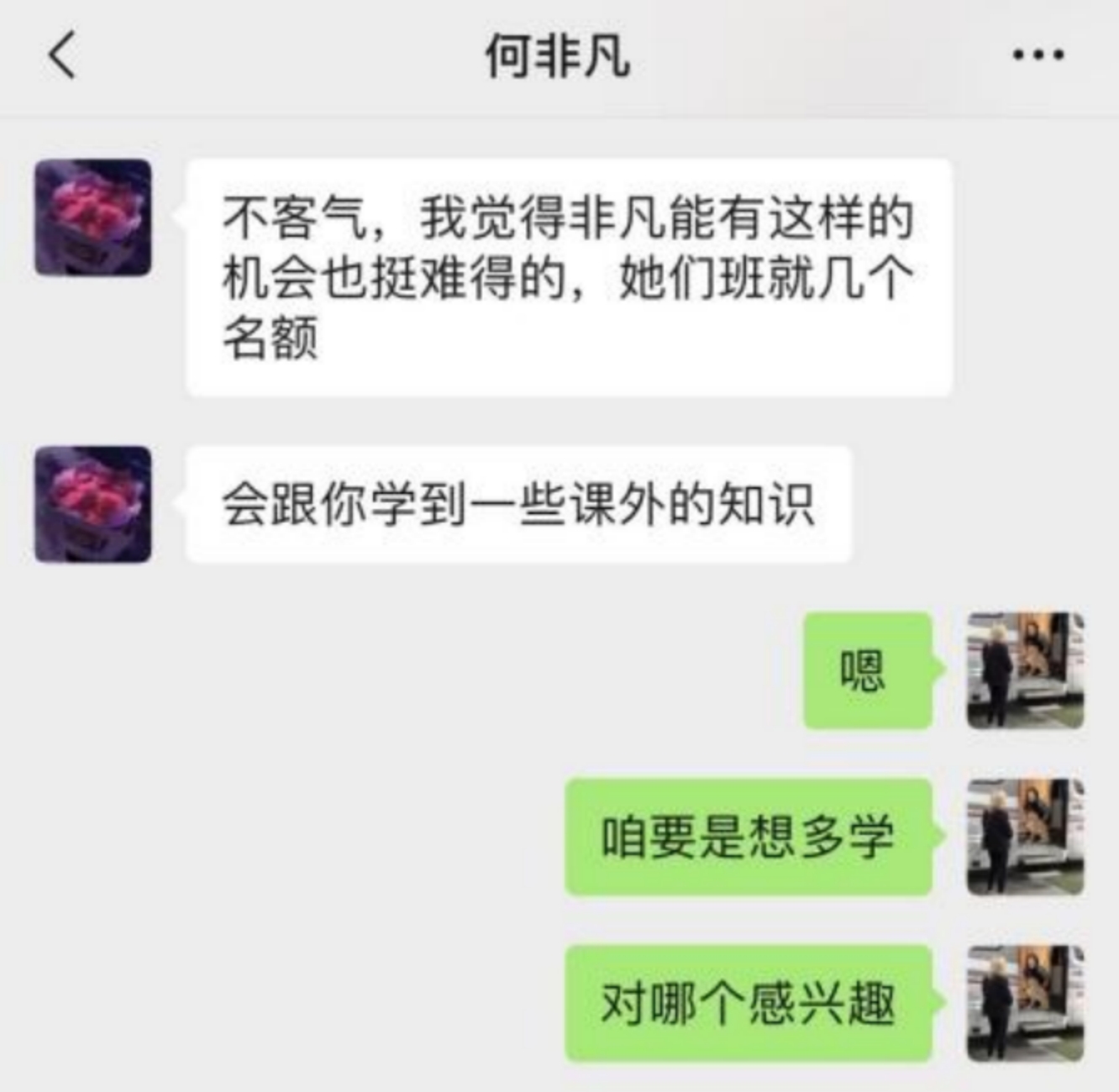后来选择的课程是《钱的学问》,在学习钱是如何产生的时候,因为课件的字不大,会看到小朋友在逐渐逼近摄像头,想要看的更清楚。小朋友对我句句有回应,很感动,家长也很有耐心,有的时候会有直播课,发过链接后意外地得到家长的感受,也会在平常聊天中得到家长对我的反馈。