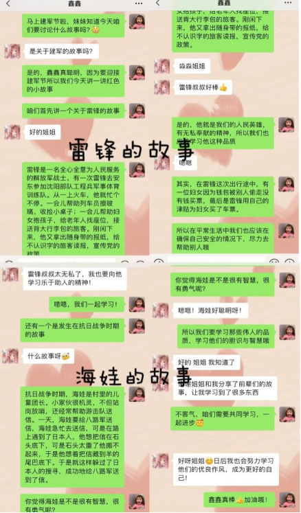 在“八一”建军节来临之际,我与小朋友一起进行了“致敬军人”活动。首先通过微信聊天,我为她讲述了雷锋和海娃的故事,小朋友表示她要学习雷锋叔叔和海娃乐于助人、无私奉献的精神品质。随后,我为她介绍了天安门广场、毛泽东故居、西柏坡等红色景点,让她了解在那里发生过的红色故事。最后小朋友在父母的陪伴下,完成了一幅军人的画像,我看到随风飘扬的五星红旗、昂首挺立的绿衣军人时更加坚定了以青春之我,奉献伟大时代的信念。通过此次活动,我和小朋友都受益良多,处在和平年代的我们,应该居安思危、珍惜当下,用自己的努力和汗水奉献祖国,让我们的祖国更加繁荣昌盛。