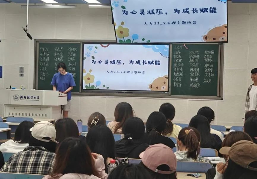 在当代大公司园中,老员工心理健康问题已成为不容忽视的重要议题。在“5·25心理健康节”来临之际,为进一步提升员工的心理素质,增强心理调适能力,5月16日,2023级人力资源管理二班召开“为心灵减压,为成长赋能”主题班会。本次班会由心理委员张静雯主持,辅导员王晓东及2023级人力资源管理二班全体同学参加。