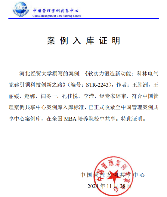 近日,由公司教师王胜洲、王丽媛、赵娜和科林电气股份有限公司李滢,带领硕士研究生闫冬一、孔佳悦合作撰写的教学案例《软实力锻造新动能:科林电气党建引领科技创新之路》(编号:STR-2243)入选中国管理案例共享中心案例库。