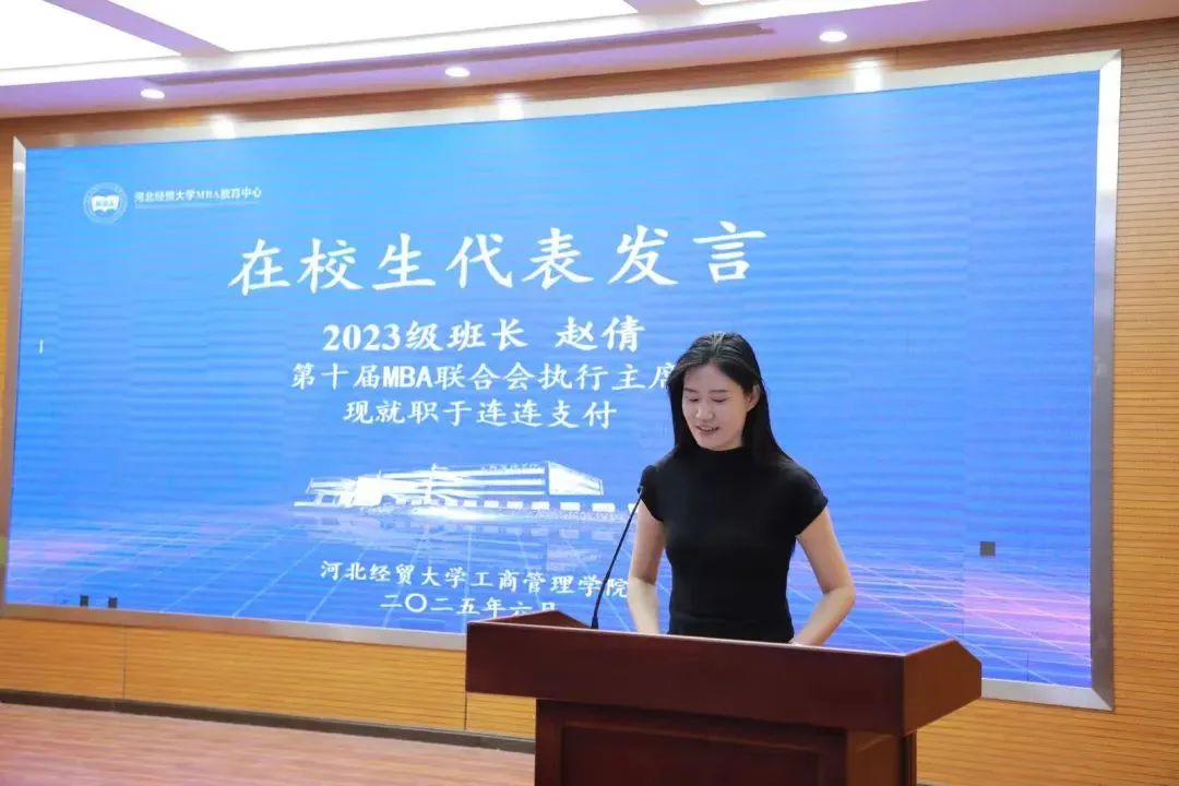 赵倩代表在校生致辞。首先,代表全校在校生向圆满完成学业的毕业生们致敬。深受学长学姐的辉煌事迹激励,在校生们将以更加饱满的热情投入到工作和学习中,努力传承并发扬MBA的荣光,在各自道路上书写精彩篇章。最后祝愿学长学姐前程锦绣如画。