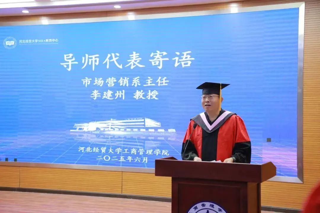 李建州代表导师致辞。首先,祝贺毕业生们坚持书写的步伐。其次,期待同学们在变革中保持清醒并提出三点希望。第一,希望同学们保持学习,既能运用所学又能跳出固定的思维模式,用创新思维解决真实世界的难题;第二,追求卓越,但不要忘记责任。未来的管理者不仅要创造经济价值,还要为员工和社会创造价值;第三,拥抱变化,但不要失去初心。在追逐风口的同时,永远记得来时路。最后希望同学们可以笑对生活,在各自工作岗位上作出卓越的贡献。