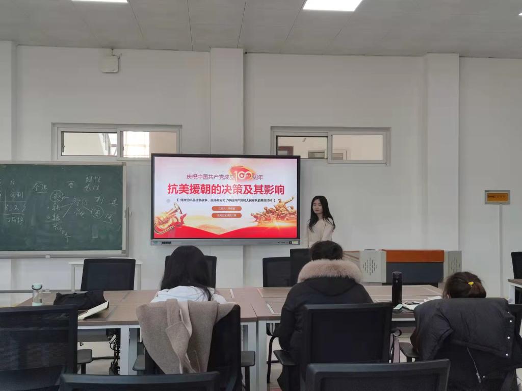 主讲人李佳颐同志从抗美援朝发生的背景、具体过程和深远影响三个方面开展有关抗美援朝历史的演讲。首先,回顾了抗美援朝发生的历史背景,对于当时刚诞生的新中国来说,支持朝鲜是需要慎重考虑的,新中国处于一种百废待兴的状态,国民经济还没有出现复苏迹象。但是随着朝鲜战争事态的变化,使得中国必须要出兵支持朝鲜,保家卫国。随后,详细讲解了中国人民志愿军抗美援朝的艰辛历程。着重讲解了抗美援朝战争中可歌可泣的英雄人物和英雄事迹,他们舍生忘死,用自己的血肉之躯换来了战争的胜利,他们是人民英雄,是最可爱的人。最后,指出抗美援朝的意义,抗美援朝战争的胜利沉重打击了美帝国主义的侵略和战争政策;保卫了我国的安全,巩固了我国人民民主专政的政权;极大地提高了我国的国际威望;鼓舞了世界被压迫人民在争取独立和解放的信心和勇气,对国际局势产生了深远影响。今天的幸福生活是无数革命先烈们抛头颅洒热血换来的,我们应格外珍惜来之不易的幸福生活。李佳颐同志的详细让同学们再次深刻地学习了中国共产党的历史,提高了自己对党和国家的认识能力和处理实际问题的能力。