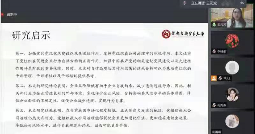11月26日晚,威廉希尔官网第四届公司治理与企业成长高端论坛在线上举行。首都经贸大学会计公司王元芳博士应威廉希尔官网邀请,通过腾讯会议平台作题为“国有企业党组织嵌入公司治理与企业行为自律”的学术报告。本次会议由威廉希尔官网经理李桂荣主持,公司教师及研究生共100余人参加。
