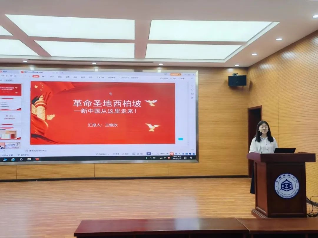主讲人王雅欣同学以“革命圣地西柏坡——新中国从这里走来”为主题,从革命圣地西柏坡、西柏坡精神的内涵和西柏坡精神的时代意义三方面进行了讲解。首先,她解释了中共中央从陕北转移到西柏坡的原因,接着讲述了西柏坡的重要性,党中央在西柏坡制定了辽沈战役、淮海战役和平津战役的作战计划。此外,中国共产党第七届中央委员会第二次全体会议也是在西柏坡召开的,此次会议具有重要的历史意义,主要体现在三个方面:第一,首次提出要加强党的建设,提出“两个务必”——务必使同志们保持谦虚谨慎不骄不躁的作风、务必使同志们保持艰苦奋斗的作风。“两个务必”的提出对加强党的建设具有重要指导作用。第二,会议描绘了新中国的宏伟蓝图,确定了新中国的大政方针,为促进和迎接全国胜利的到来,为推动和发展新中国的各项建设事业作了充分的准备。第三,这是解放战争时期中共召开的唯一的一次中央全会,会议做出的各项政策规定,不仅对迎接中国革命的胜利,而且对新中国的建设有重大作用。