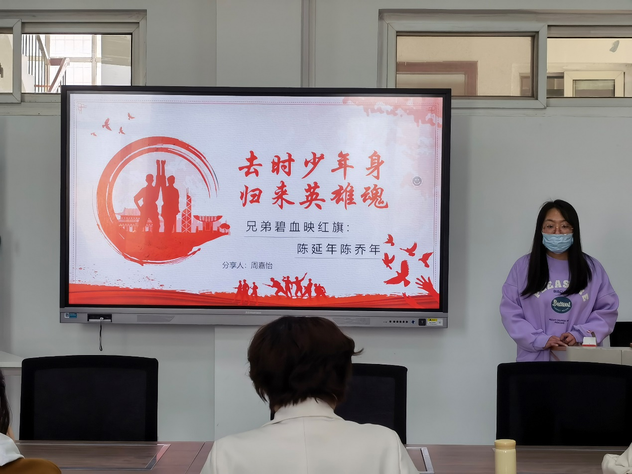 主讲人周嘉怡同学以“兄弟碧血映红旗:陈延年陈乔年”为主题, 从人物简介、生平事迹和后世缅怀三方面讲述了伟大的革命烈士陈延年陈乔年的故事。首先,介绍了满门忠烈的陈家。陈家三杰,即陈独秀、陈延年和陈乔年。陈独秀,中国新文化运动的发起人,中国文化启蒙运动的先驱,五四运动的总司令,中国共产主义运动的先行者,中国共产党创始人,中共早期最高领导人。陈延年,陈独秀长子,是中国共产党早期著名活动家、卓越领导人和杰出的无产阶级革命家。陈乔年,陈独秀次子,是中国共产党早期著名活动家、卓越领导人和杰出的无产阶级革命家。其次,简要概括了陈家两兄弟的生平事迹。在那个动荡的年代,条件艰苦,两兄弟通过半工半读、勤工俭学的方式汲取更多的知识。1915年,入上海法语补习公司学习;1917年,进入震旦大学学习,同年赴法国留学;1922年,发起成立旅欧中共少年共产党,同年,转为中国共产党党员,是中共旅欧支部领导成员;1923年,到苏联莫斯科东方劳动者共产主义大学学习。1924年,两兄弟回国。陈延年接任中共广东区兼组织部长,后接替周恩来任中共广东委书记,领导了省港大罢工。陈乔年先后任中共北京地委组织部部长、北方区委组织部部长。然而,在动荡混乱的时代,死亡的雾霾随时笼罩在革命者的上方。1927年,陈延年在上海被捕,宁死不屈,被国民党反动派乱刀砍死,时年29岁。1928年,陈乔年被国民党杀害于上海龙华,时年26岁。两条鲜活的生命就这样消逝,他们的生命定格在了最璀璨的青年时代。虽然他们永远离开,但是他们的精神永垂不朽。在两兄弟身上,突出体现了“坚持真理、坚守理想”“不怕牺牲、英勇斗争”的伟大建党精神。他们革命的初衷不是为了饭碗,不是为了自己的功名利禄,而是为了共产主义和信仰,为了更多的人能吃饱饭,能有衣穿,能不受欺负和压迫。最后,讲述后世对两兄弟的缅怀。她指出,英雄逝去,精神永存。在上海龙华烈士陵园中,他们的墓碑前总是摆满了鲜花,一束束鲜花代表了后世对他们的感谢与缅怀。在安徽,有一条以两兄弟名字命名的路——延乔路。令人惊叹的是,延乔路的尽头是繁华大道,这是对两兄弟的最好纪念。他们从风雨中走来,倒在了泥泞中,后来人踏着他们走出的路,奔赴黎明。幸好,这盛世繁荣如他们所愿。