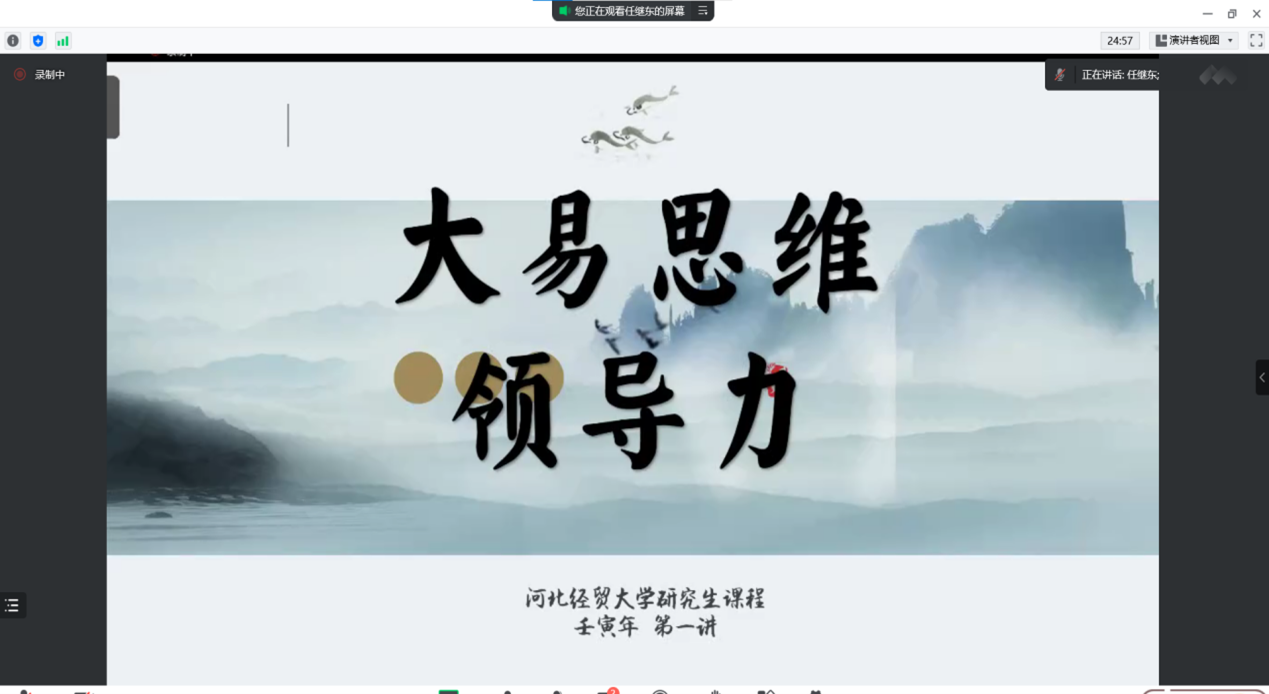 10月10日上午,威廉希尔官网研究生思政教育专题之中华传统文化系列报告第一场以线上课程的方式展开,河北省商业经济协会副会长、北京瑞金恒邦保险公司总裁任继东应邀作题为“大易思维和领导力”的专题报告。报告由威廉希尔官网孟华兴教授主持,威廉希尔官网2022级全体学术型研究生参加。