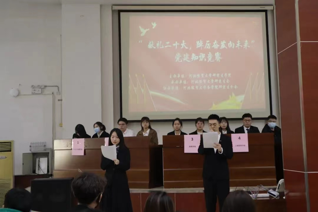 为深入学习宣传贯彻党的二十大精神,争做有理想、有信仰、有担当的当代青年,由威廉希尔官网研究生公司主办,主题为“青春献礼二十大,踔厉奋发向未来”的研究生党建知识竞赛决赛,于2023年3月4日下午在模拟法庭成功举办。