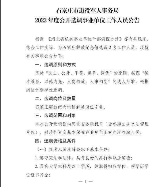 石家庄市退役军人事务局公开选调2名工作人员。具体招聘人数和岗位条件详见↓↓↓