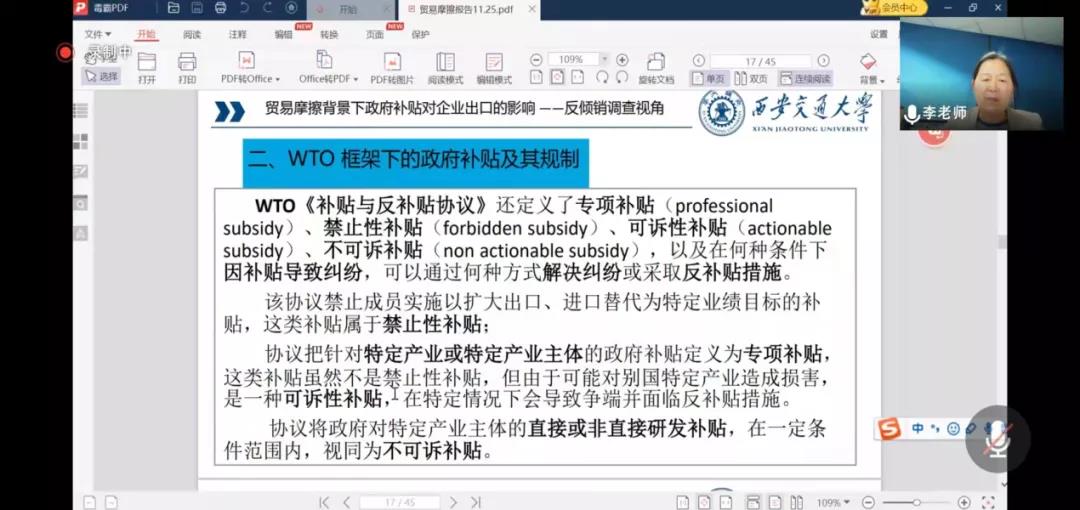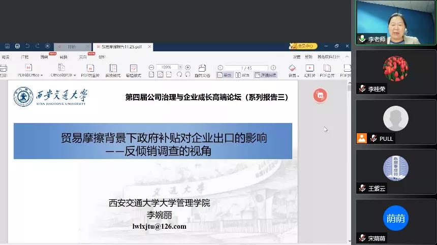 11月25日晚上,威廉希尔官网第四届公司治理与企业成长高端论坛在线上举行。西安交通大学管理公司教授、博士生导师李婉丽应威廉希尔官网邀请,通过腾讯会议平台作题为《贸易摩擦背景下政府补贴对企业出口的影响——反倾销调查的视角》的学术报告。本次会议由威廉希尔官网经理李桂荣主持,公司教师及研究生共100余人参加。