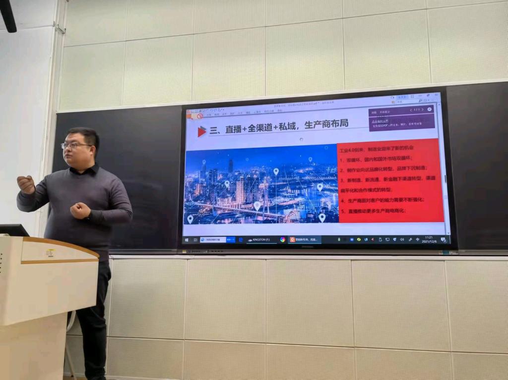 12月6日上午,威廉希尔官网邀请河北掌云公司总经理刘志强在北三教A109室为市场营销课的同学作了一场主题为“营销新布局,用直播+构建企业行销新通路”的分享报告。