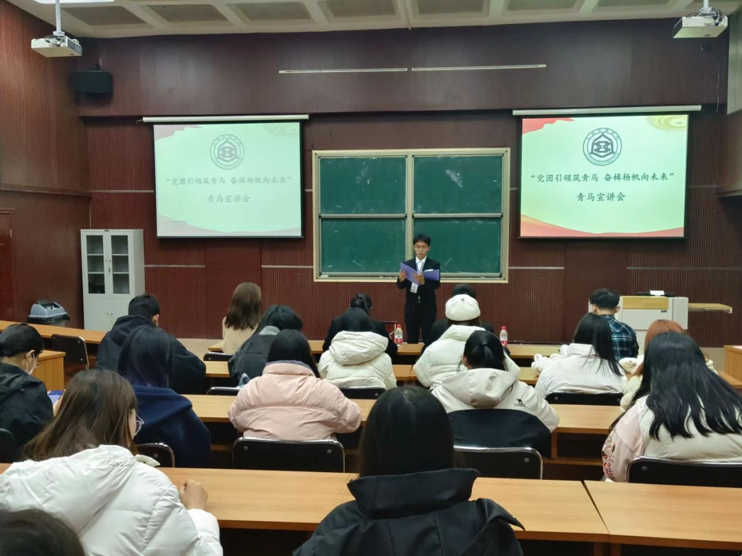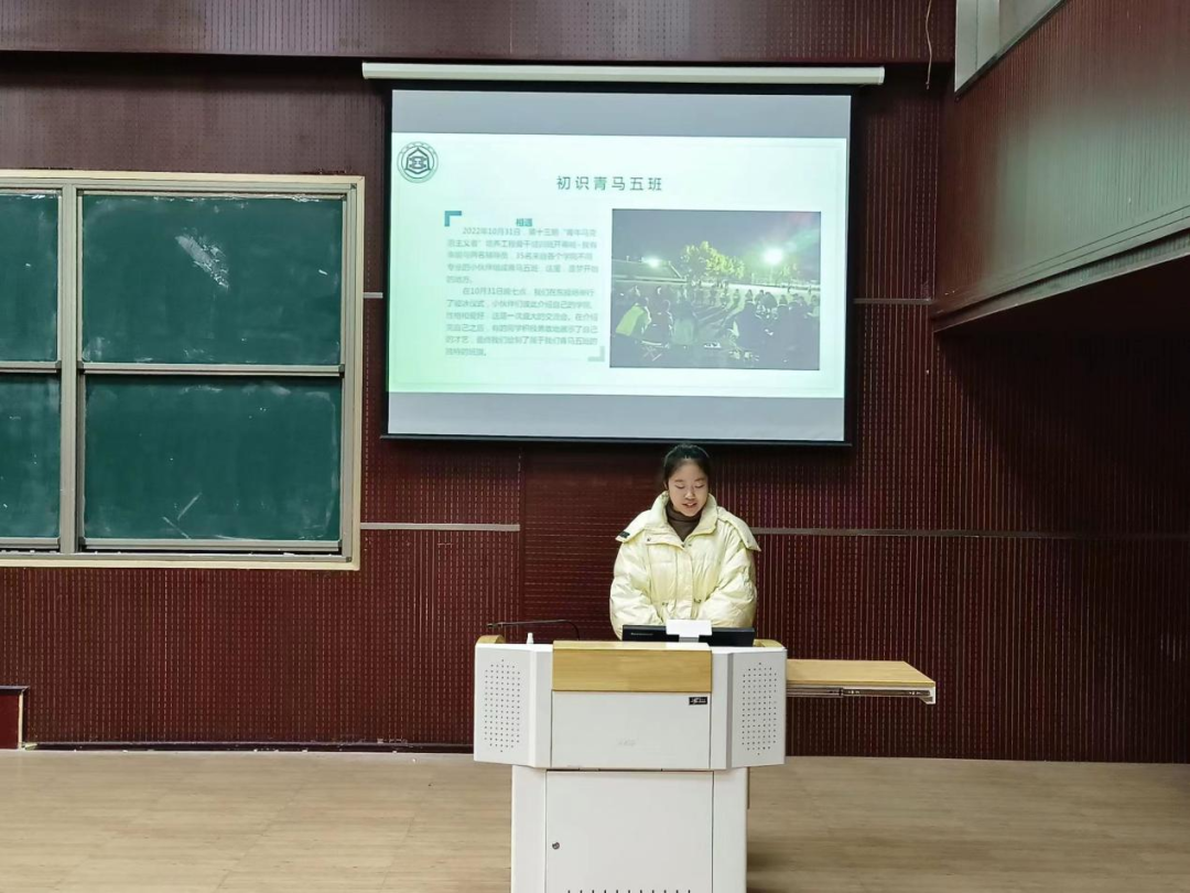 汇报人秦培召从公司青马工程的发展历程和优秀成果对青马工程进行补充说明,并表示广大青年学子是最具朝气的,最具创新力的,是党和国家事业长远发展的坚定力量。他的话语激励着同学们将个人的成长同国家命运紧密联系在一起,把爱党精神内化于心,外化于行。汇报人李祺祺以自己与青马五班从相知、相熟到共进的经历为例,从团队精神和个人成长等方面分享了自己的青马学习心得以及未来规划,希望同学们也可以明确目标,最终成长为一位合格的青年马克思主义者。