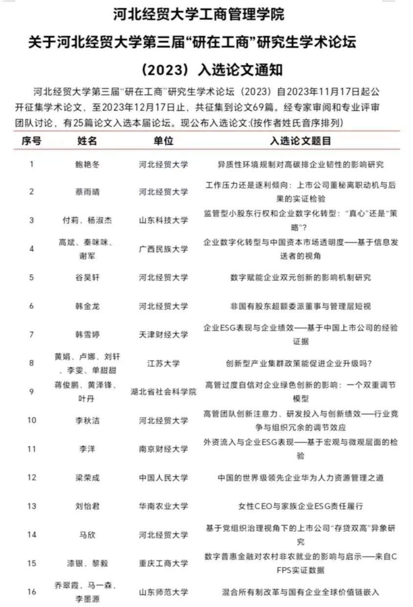 关于威廉希尔官网第三届“研在工商”研究生学术论坛(2023)入选论文通知