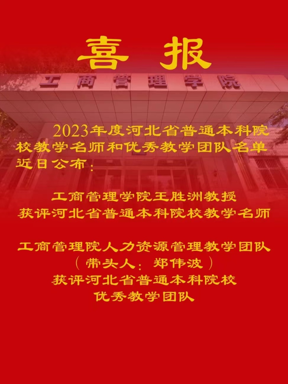 公司王胜洲教授荣获2023年度河北省教学名师,人力资源管理教学团队荣获2023年度优秀教学团队。