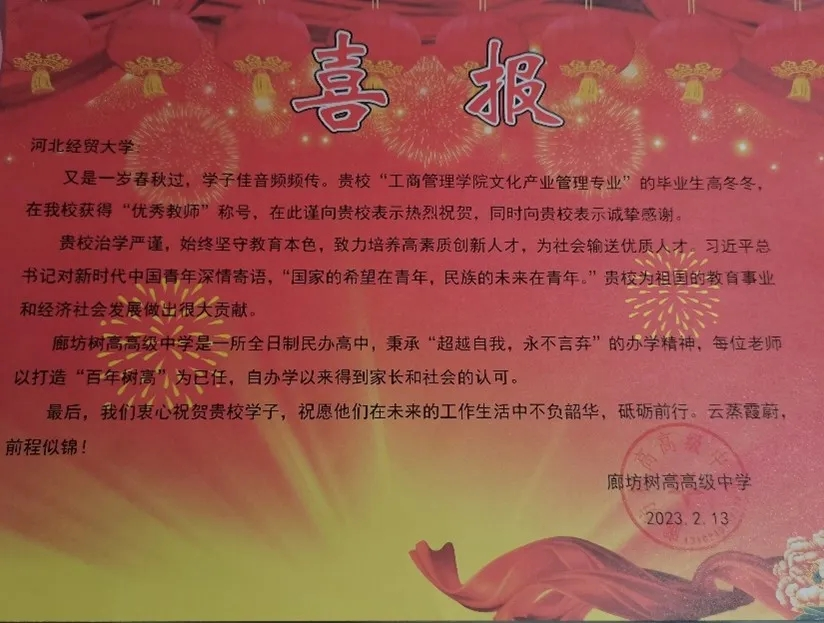 公司文化产业管理专业毕业生高冬冬荣获廊坊树高高级中学“优秀教师”称号。