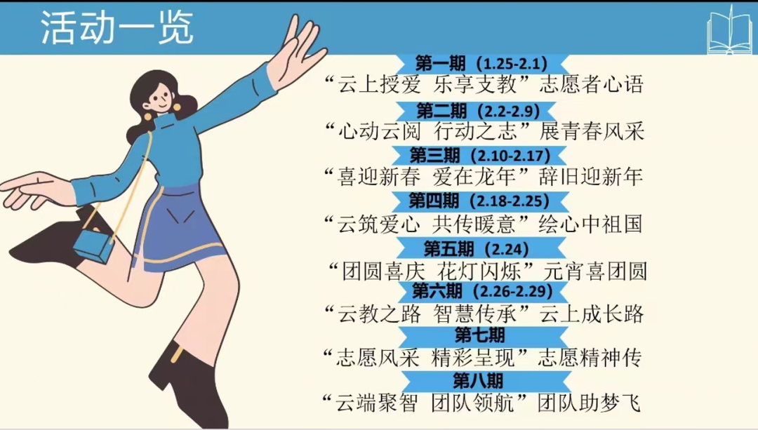 云支教活动,让我们与不同的人相遇,相遇不一定有结局,但一定有意义。希望每一位志愿者以十足的精神积极参与本次实践,这不仅是一次锻炼自我的机会,更是对“奉献,互助,友爱,进步”志愿者实践精神的诠释,希望大家继续以坚强的意志、认真的态度,积极的行动去完成这次云支教活动,帮助更多的人学习知识,与中小员工共同描绘名为青春的诗篇。