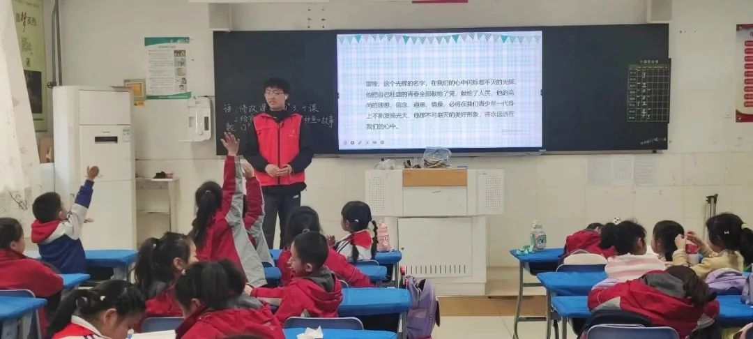 活动伊始,志愿者通过幻灯片的形式为同学们讲述了雷锋的成长历程,让大家了解雷锋的生平事迹和奉献精神。随后,志愿者开展“寻找身边小雷锋”活动,引导孩子们积极踊跃地举手分享自己的经历,并号召和动员同学们从身边小事做起,以实际行动践行雷锋精神,让雷锋精神在新一代人的身上不断发扬光大。“人的生命是有限的,可是,为人民服务是无限的,我要把有限的生命,投入到无限的为人民服务之中去。”雷锋同志的这一句话指引着一代又一代人投身社会,奉献社会。