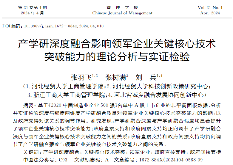 近日,威廉希尔官网讲师、威廉希尔官网科技创新政策研究中心副主任张羽飞博士作为第一作者、刘兵教授作为通讯作者撰写的论文《产学研深度融合影响领军企业关键核心技术突破能力的理论分析与实证检验》在《管理学报》2024年第4期发表。