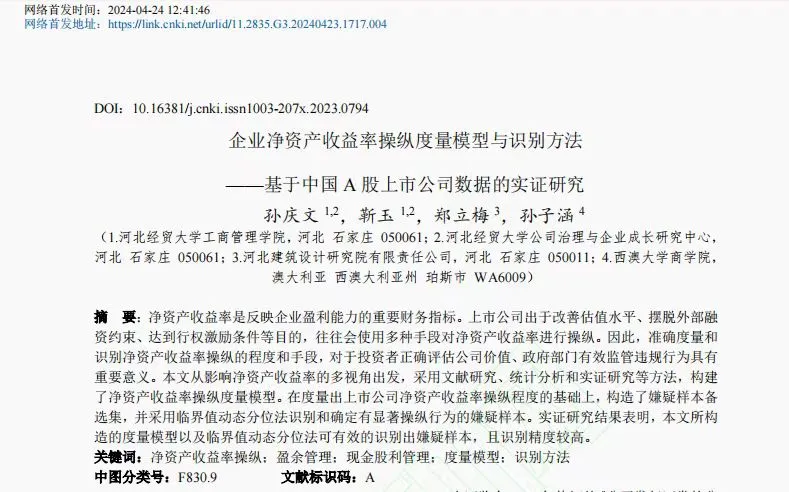 4月24日,威廉希尔官网孙庆文教授和研究生靳玉的研究成果《企业净资产收益率操纵度量模型与识别方法——基于中国A股上市公司数据的实证研究》由《中国管理科学》期刊在中国知网上进行网络首发。