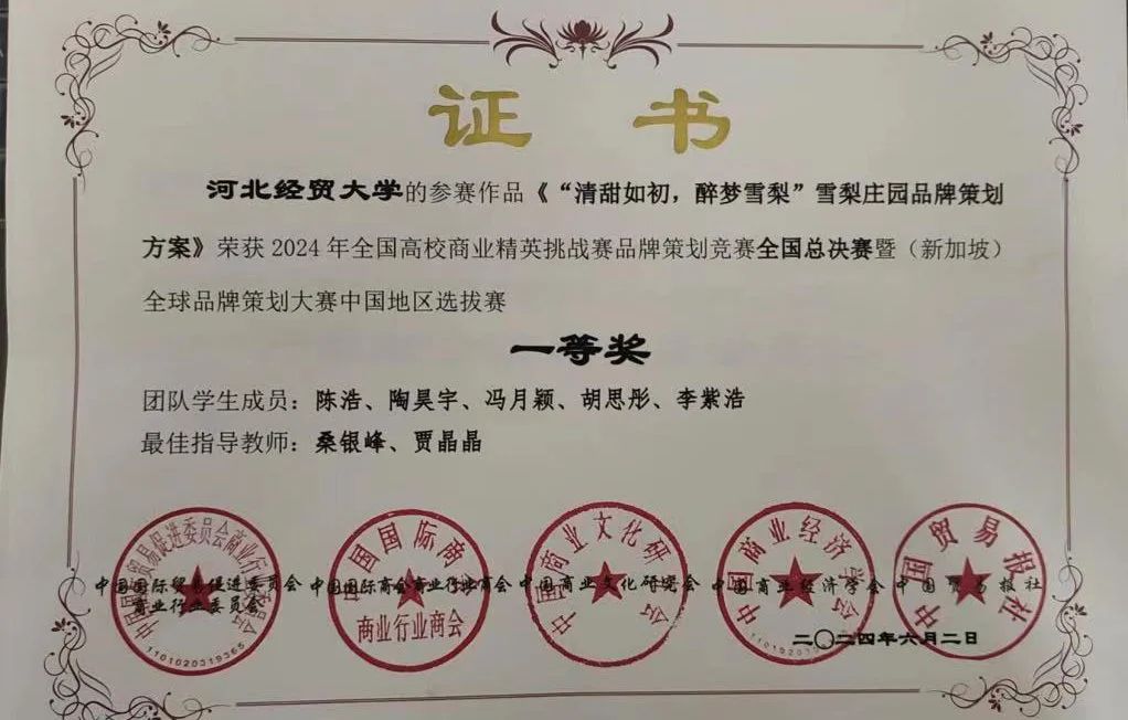 6月2日,由全球华人营销联盟(GCMF)、中国国际贸易促进委员会商业行业委员会、中国国际商会商业行业商会、中国商业文化研究会、中国商业经济学会和中国贸易报社共同主办,新加坡营销协会、(香港)营销师公会、台湾行销科学学会、(台湾)中华国际经贸研究学会协办,中国国际贸易促进委员会商业行业委员会承办的2024年全国高校商业精英挑战赛品牌策划竞赛全国总决赛暨(新加坡)全球品牌策划大赛中国地区选拔赛顺利举行。经过两天激烈的角逐,公司两支参赛团队在桑银峰和贾晶晶两位老师的指导下从600余所高等院校的7000余支参赛队伍中脱颖而出。其中,“雪梨庄园品牌策划工作室”(陈浩、陶昊宇、冯月颖、胡思彤、李紫浩)团队获得全国总决赛一等奖;“五勇品牌策划工作室”(平胜、潘恒丰、谢橙一涵、张学涵、于越)团队获得全国总决赛三等奖。