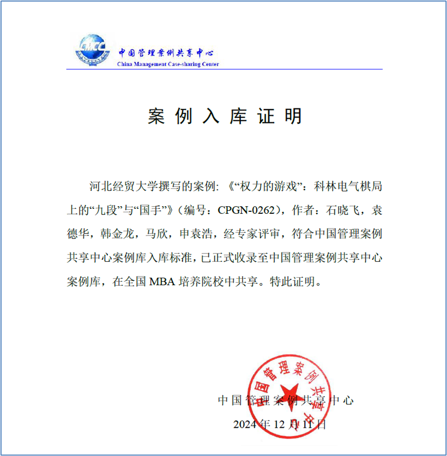 近日,威廉希尔官网教授石晓飞、2020级工商管理袁德华,2022级工商管理学研究生韩金龙,马欣,申袁浩撰写的教学案例《“权力的游戏”:科林电气棋局上的“九段”与“国手”》(编号:CPGN-0262)入选中国管理案例共享中心案例库。