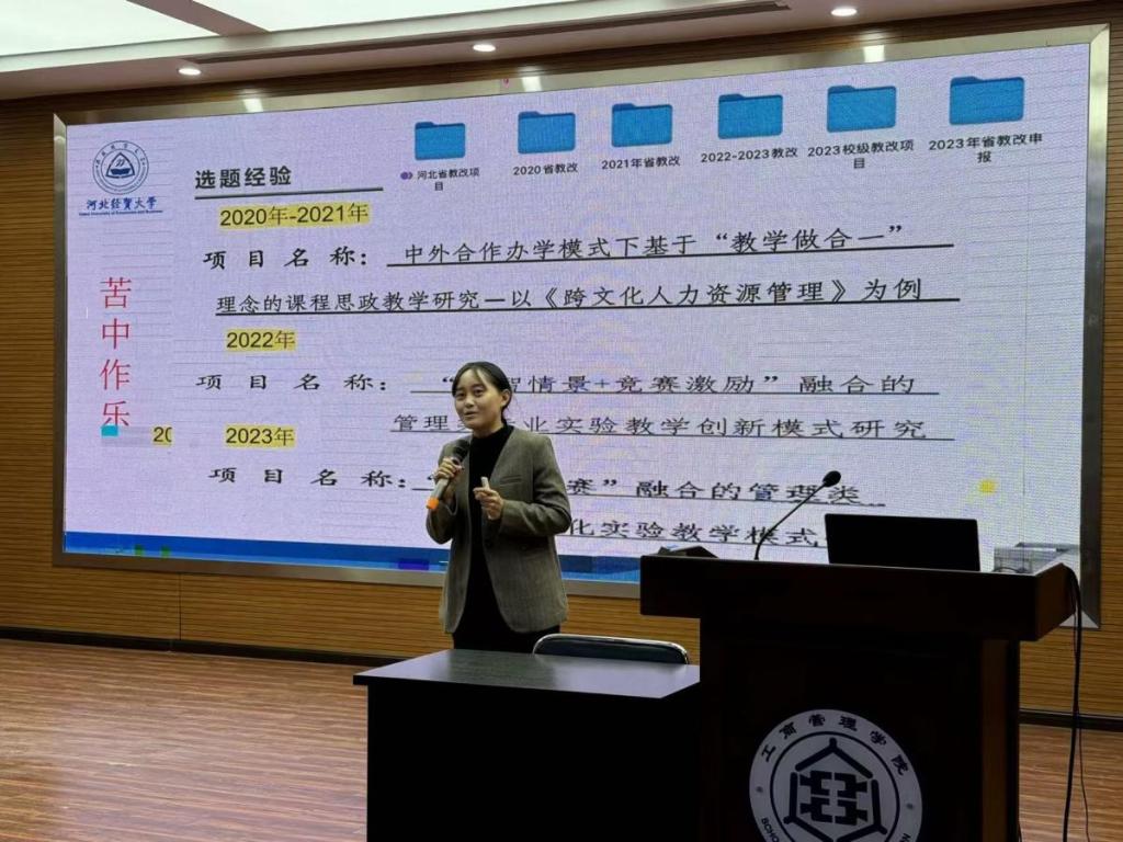 随后,张静就本次申报教研项目的一些思考与青年博士进行分享,她将中华优秀传统文化与人力资源管理课程相结合,既深耕了专业课程,更弘扬了文化自信和民族自豪。她表示,青年教师应基于个人兴趣和特长锚定一具体方向长期耕耘,同时也要以国家政策为导向,贴合专业公司产品中的痛点与重点,做出满足时代需求、回答现实问题、体现个人思考的教研项目。