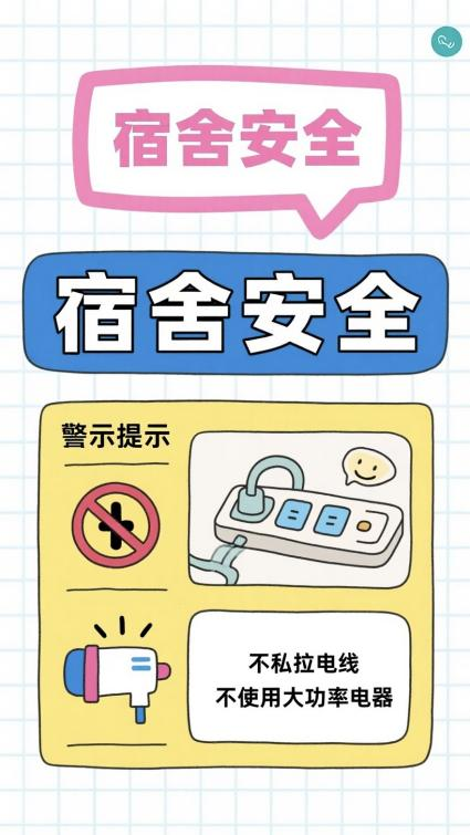 4.宿舍入住查细节:进入宿舍后,检查门窗、水电开关是否完好,发现损坏及时联系宿管报修;不私拉乱接电线,不使用电炉、电暖器等大功率电器,避免消防安全隐患。