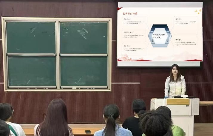 随后,沈琦琦组织观看了经典抗战影片片段,生动的影像资料让历史书本上的文字变得鲜活而震撼,同学们无不为革命先烈英勇无畏的牺牲精神所动容。在接下来的“抗战故事分享会”上,同学们深情讲述了杨靖宇、赵一曼等抗日英雄可歌可泣的事迹,将活动现场气氛推向高潮,引发了强烈的情感共鸣。