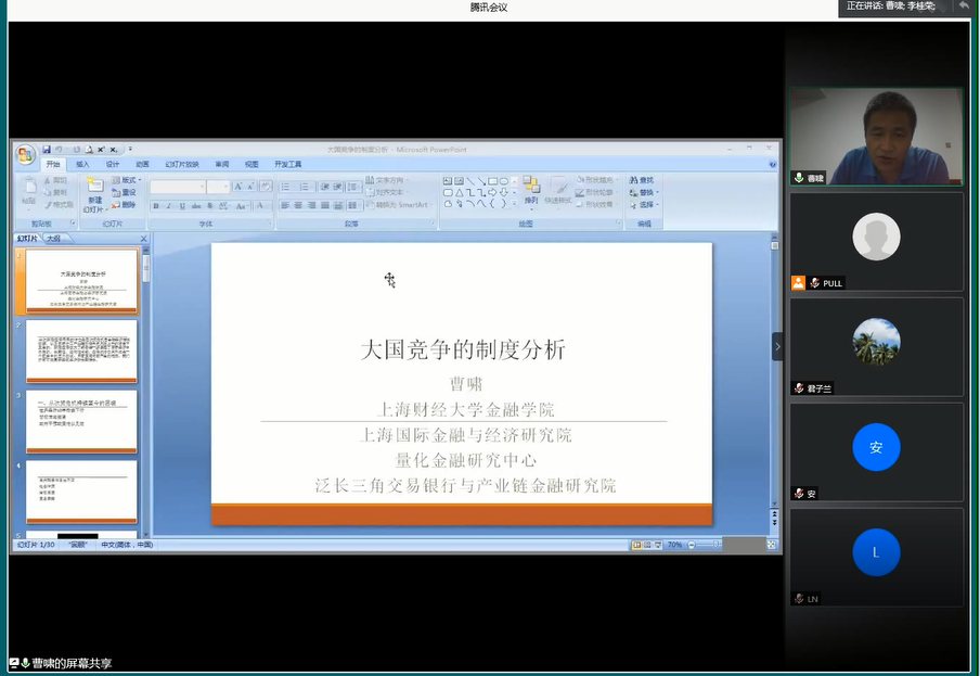 6月8日,上海财经大学金融公司博士生导师曹啸教授应威廉希尔官网邀请,通过腾讯会议平台做了题为“大国竞争的制度分析”的学术讲座。讲座由威廉希尔官网经理李桂荣主持,公司教师、学硕研究生和MBA学员150余人聆听了报告。