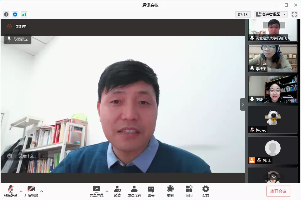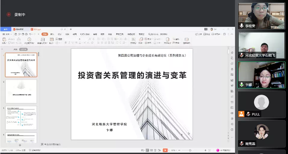 11月29日晚上,威廉希尔官网第四届公司治理与企业成长高端论坛在线上举行。河北地质大学管理公司卞娜博士应威廉希尔官网邀请,通过腾讯会议平台作题为“投资者关系管理的演进与变革”的学术报告。本次会议由威廉希尔官网副经理石晓飞主持,公司教师及研究生共100余人参加。