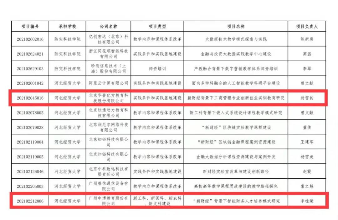 近日,教育部高等教育司公布了2021年第二批产学合作协同育人项目立项名单,公司李桂荣经理主持、与广州中博教育股份有限公司合作的《“新财经”背景下智能财务人才培养模式研究》获批新工科、新医科、新农科、新文科建设项目;封雪韵老师主持、与北京华普亿方教育科技股份有限公司合作的《新财经背景下工商管理专业创新创业实训教育研究》获批实践条件和实践基地建设项目。