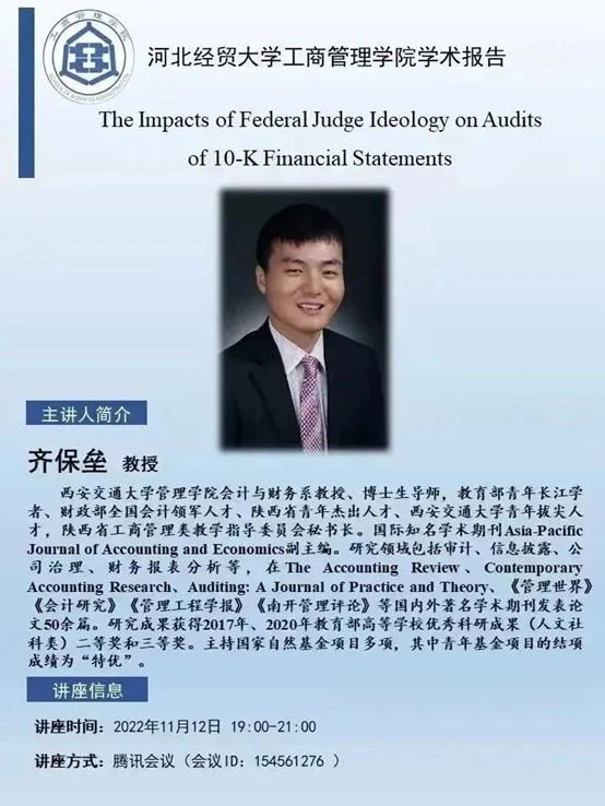 威廉希尔官网学术报告:The Impacts of Federal Judge Ideology on Audits of 10-KFinancial Statements,将于11月12日19:00—21:00在腾讯会议(会议ID: 154561276)举行,大家准时参加哦。