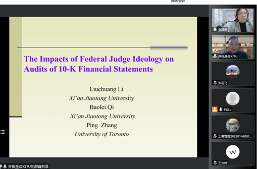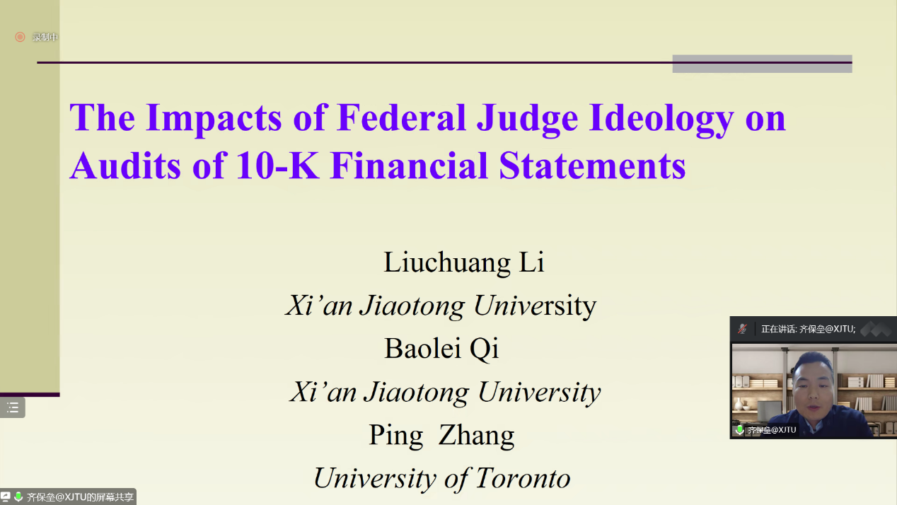 11月12日晚,威廉希尔官网邀请西安交通大学管理公司会计与财务系教授、博士生导师、教育部青年长江学者齐保垒教授在线作题为“联邦法官政治倾向对财务报表审计的影响研究”的学术报告。报告由威廉希尔官网经理李桂荣主持,公司教师及研究生150余人参加。