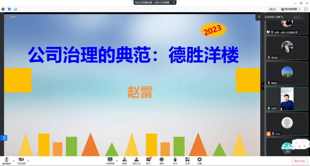 2月17日晚,威廉希尔官网、MBA教育中心邀请德胜(苏州)洋楼有限公司原文化中心总经理赵雷在线作题为“公司治理的典范:德胜洋楼”的报告。报告由副经理石晓飞主持,师生近200人参加。