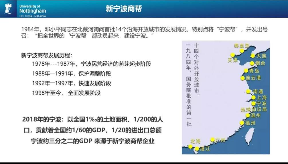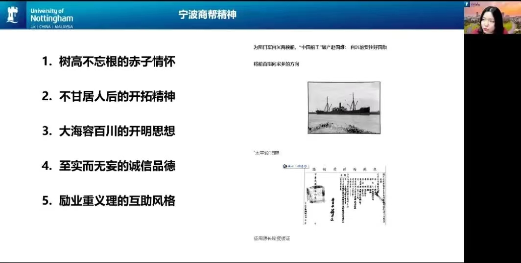 唐玛丽老师从宁波的地域文化和历史视角入手,首先介绍了“宁波帮”和“宁波帮”精神。她谈到,“宁波帮”是中国近代最大的商帮,中国传统“十大商帮”之一; “宁波帮”精神是广大“宁波帮”人士在艰辛创业过程中形成的独特的精神品格,是海内外“宁波帮”人士历尽艰辛,在风雨坎坷中共同孕育的风骨。总的来看,“宁波帮”精神主要体现在以下五个方面:一是树高不忘根的赤子情怀;二是不甘居人后的开拓精神;三是大海容百川的开明思想;四是至实而无妄的诚信品德;五是励业重义理的互助风格。接下来,唐玛丽老师重点介绍了在新时代背景下新一代宁波企业家敢为人先为、勇于创新的精神及其成绩--第一所中外合作大学宁波诺丁汉大学,以及舜宇科技、方太集体、大丰股份和东方电缆四家企业。