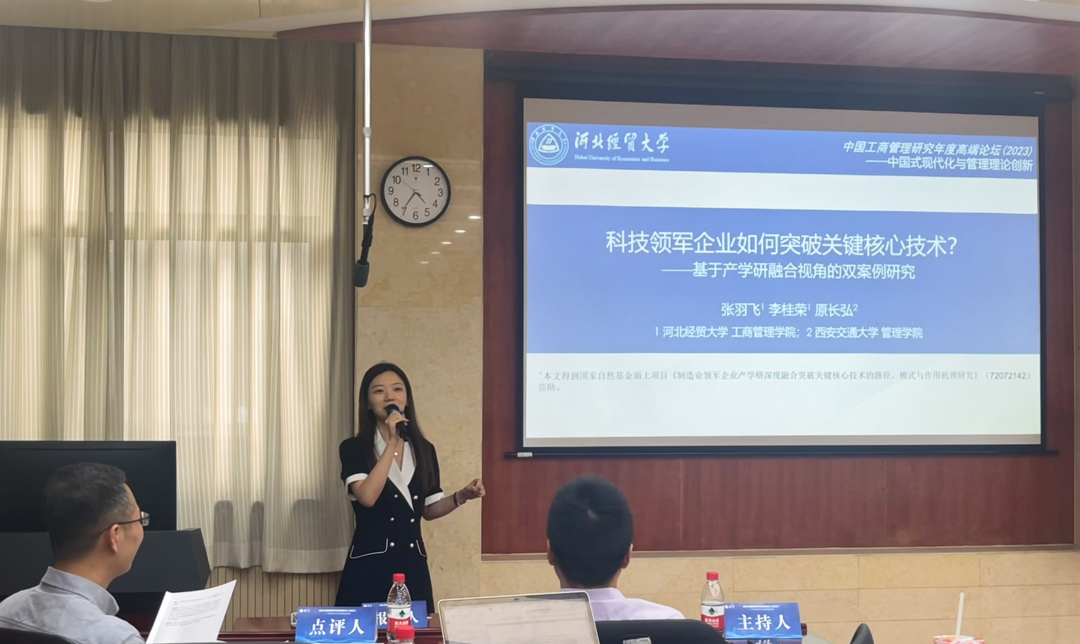 5月20日,公司青年教师张羽飞博士应邀参加了在西安交通大学举办的中国工商管理研究年度高端论坛(2023),并汇报交流论文。该论坛由中国社会科公司《经济管理》杂志社主办,西安交通大学管理公司、教育部大数据管理课程虚拟教研室承办,中国社科院财政与财务研究中心、中国CFO发展中心、会计学术联盟协办,受到了学术界与实践界的广泛关注和热烈响应,来自全国几十所高校与科研院所的200余名专家学者出席了本次盛会,线上会议直播播放量达20万余次。公司张羽飞、李桂荣、以及西安交大管理公司原长弘三位教师的合作论文《科技领军企业如何突破关键核心技术?——基于产学研融合视角的双案例研究》入选,并受邀在“中国式现代化与创新管理”分论坛进行汇报交流。