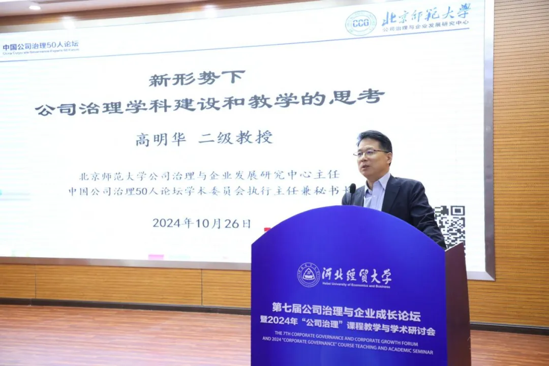 北京师范大学公司治理与企业发展研究中心主任、中国公司治理50人论坛学术委员会执行主任兼秘书长高明华教授作题为“新形势下公司治理团队建设和教学的思考”的主题报告。报告围绕《公司治理学》课程展开,从瞄准学科前沿、了解学科发展史、通晓国际化实践、直面数字时代、立足中国国情、学会知识运用六方面展开讨论。指出公司治理团队建设需要立足前沿、从经典名著中积累专业知识,结合具体企业实践展开专业知识学习,为未来的数字化发展做好准备。