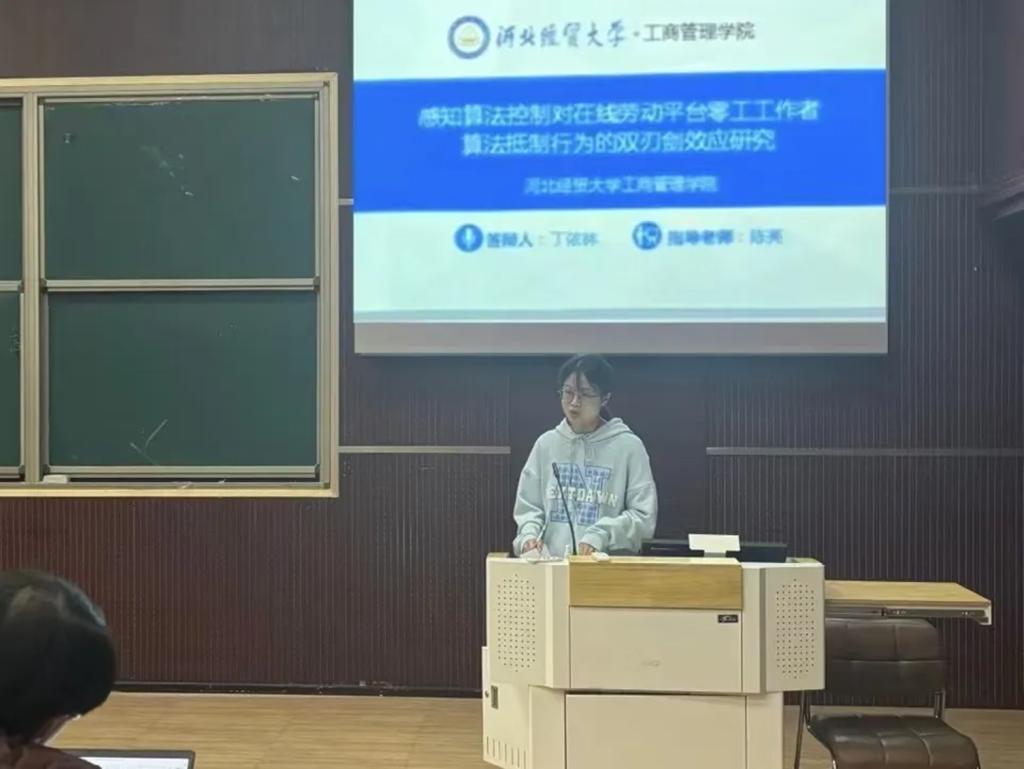 汇报人丁依林以“感知算法控制对在线劳动平台零工工作者算法抵制行为的双刃剑效应研究”为题,基于工作要求-资源模型和资源保存理论,分析了感知算法控制对算法抵制行为的积极与消极影响路径。进一步探讨了工作卷入和工作压力在感知算法控制与算法抵制行为之间的中介作用,阐明了这些心理因素如何影响零工工作者对算法的态度和行为。最后,考察了感知算法透明度在感知算法控制双刃剑效应中的调节作用。通过揭示零工工作者感知算法控制对算法抵制行为的影响机制,可以引起平台对算法抵制行为的重视,并为抑制零工工作者的算法抵制行为提供参考。