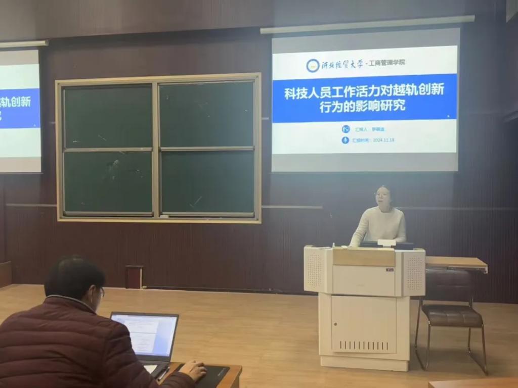 汇报人罗萌迪以“科技人员工作活力对越轨创新行为的影响研究”为题,从研究背景、研究目的、研究框架、理论基础与假设、研究结论、创新点六个部分展开汇报。以企业科技人员为研究样本,基于资源保存理论与主动动机模型,依据“资源—动机—行为”的影响路径,对工作活力在创新行为领域的有效性进行了验证,为企业管理实践提供了启示。